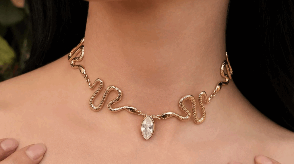 Your neckline determines the type of necklace that works best. Crew necks pair well with layered chains or statement pendants. V-necks look great with a pendant that mirrors the shape of the neckline. Strapless or off-the-shoulder styles open the door for a dramatic choker—one of Ettika’s specialties.
