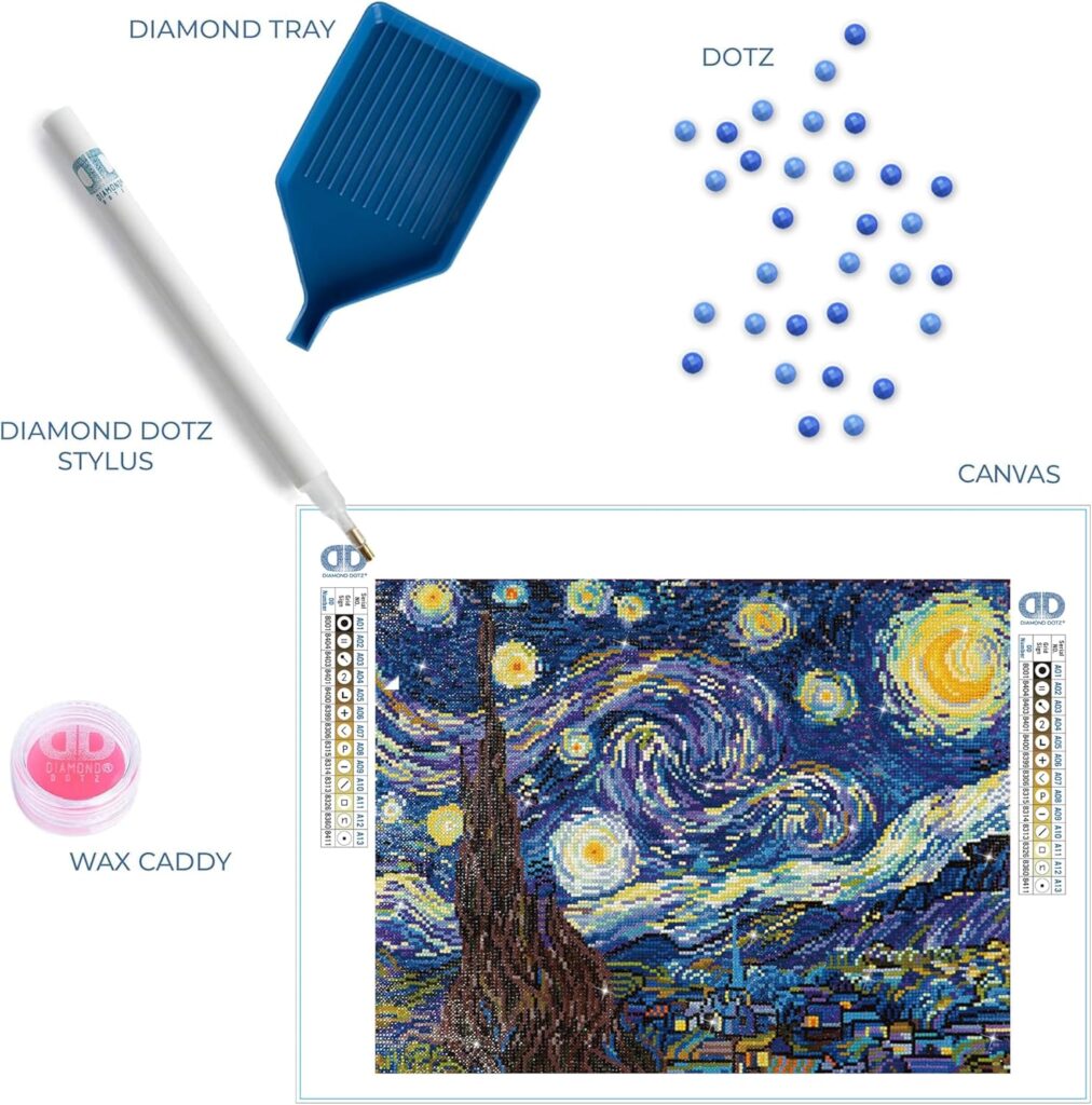 A great option is a diamond art kit like DIAMOND DOTZ Starry Night (Van Gogh) Diamond Painting Kits for Adults. These kits turn creativity into a calming hands-on experience by allowing users to place shimmering gems onto a marked canvas to create sparkling artwork.