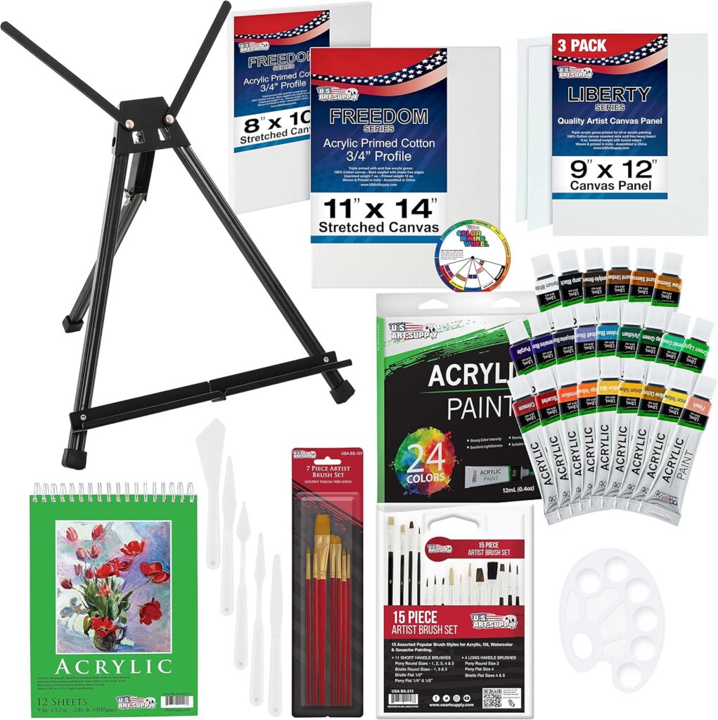 A set like the U.S. Art Supply 60-Piece Deluxe Artist Acrylic Painting Set is a convenient option because it includes a wide range of paint colors, brushes, canvases, and even a tabletop easel. Having everything in one place allows you to jump right in without worrying about whether you have the right tools.